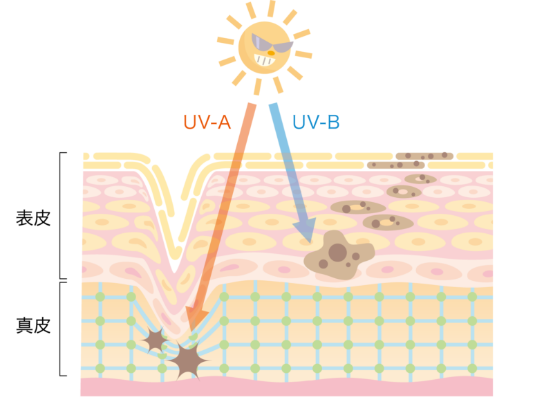 紫外線のうち、特に「UV-A」は波長が長く、肌の奥深く(真皮)まで到達します。そこで、肌の弾力を支えているコラーゲンやエラスチンを破壊してしまうのです。これが、40代が最も恐れる「たるみ」や「深いシワ」の直接的な原因になります。